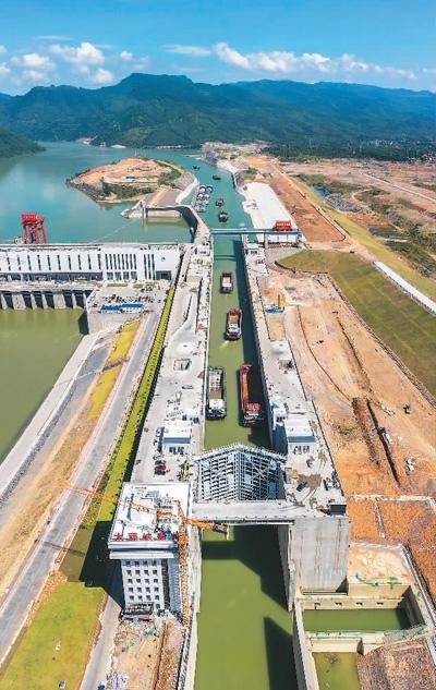 広西壯(チワン)族自治區(qū)にある大藤峽ダムの水利ターミナルプロジェクト建設(shè)で、船舶が閘門を上流に向かって運(yùn)航する様子(ドローンで撮影?曹褘銘)。