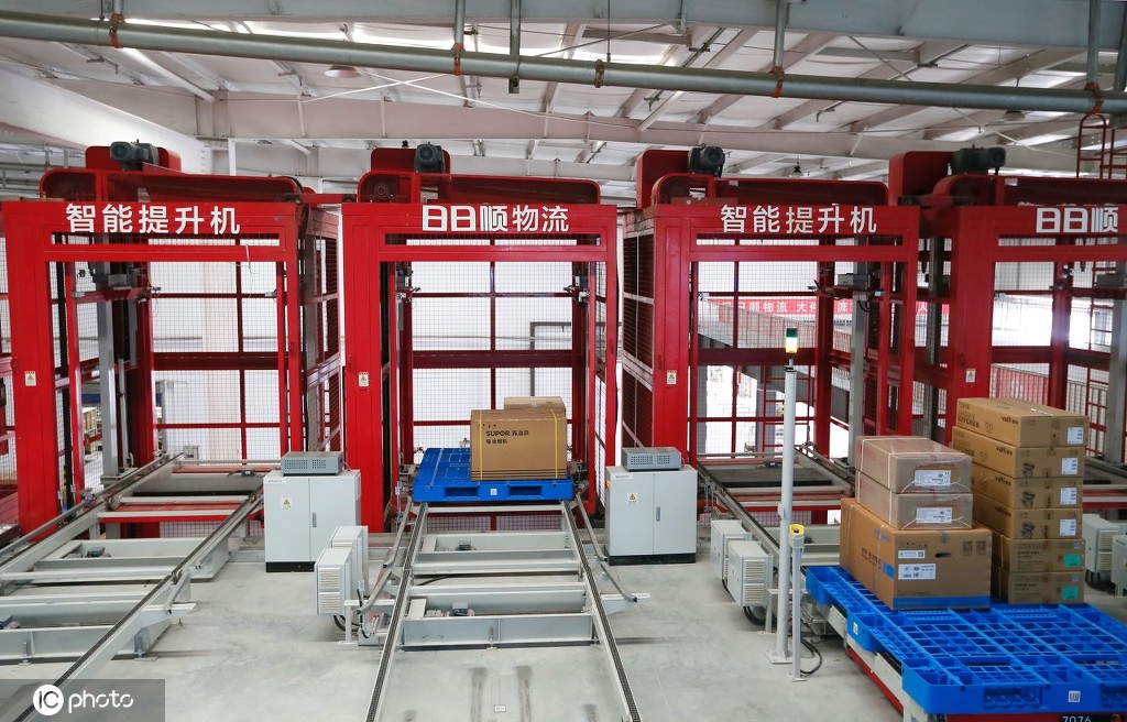 8月5日、山東省青島市即墨通済新経済區(qū)にある日日順物流(即墨)産業(yè)園で稼働中のスマート昇降機(jī)(寫真著作権は東方ICが所有のため転載禁止)。