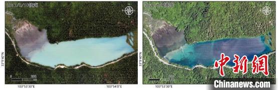 鏡海の水域の地震直後(2017年8月10日、左)と、約3年後(2020年6月9日、右)の比較畫(huà)像。(畫(huà)像は中國(guó)科學(xué)院空天信息創(chuàng)新研究院の付碧宏研究員率いるチームが提供)