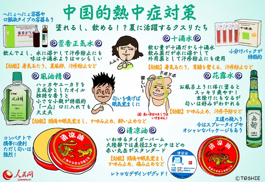 この時期、日本でも熱中癥対策という言葉をしばしば目にする。水分や塩分の補給が求められ、スポーツドリンクやここ數(shù)年は塩レモン味のキャンディーやタブレットなどの人気が高い。一方の中國でも夏場、戸外で働く人々などに熱中癥対策グッズが準備されるが、上述したスイカや緑豆のスープなどの他、「藿香正気水」や「十滴水」といった熱中癥対策の薬も準備される。これらの中醫(yī)薬は飲み薬なのだが、外用薬として汗疹予防などにも使うことができる。ただし、味は非常に飲みづらく、飲んだら卻って気分が悪くなったという話も?