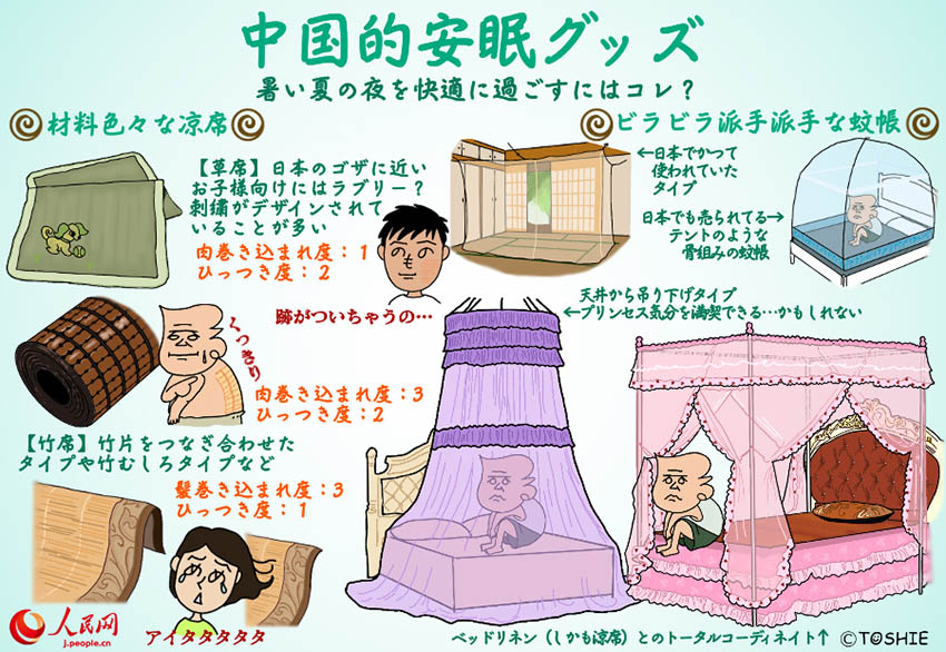 「蚊帳」と聞いても、どんなものか知らないという日本の若い人も多いかもしれない。かつては日本でも広く使われていた蚊帳だが、中國では今も健在。さすがにクーラーなどが完備された都會では使われなくなってきてはいるものの、大學の宿舎や地方などではまだまだ有効な蚊よけ手段としての存在感を示している。そして夏の寢具として「涼席」も忘れてはいけない。草を編んだ「草席」、竹をつなぎ合わせた「竹席」、さらには籐や牛の皮を使って作った涼席もある。近年では化學繊維でひんやり感がある布製の寢具も「涼席」という名で売られており、材料は何であれ、夏の寢具は「涼席」!という認識は今もしっかりあるようだ。