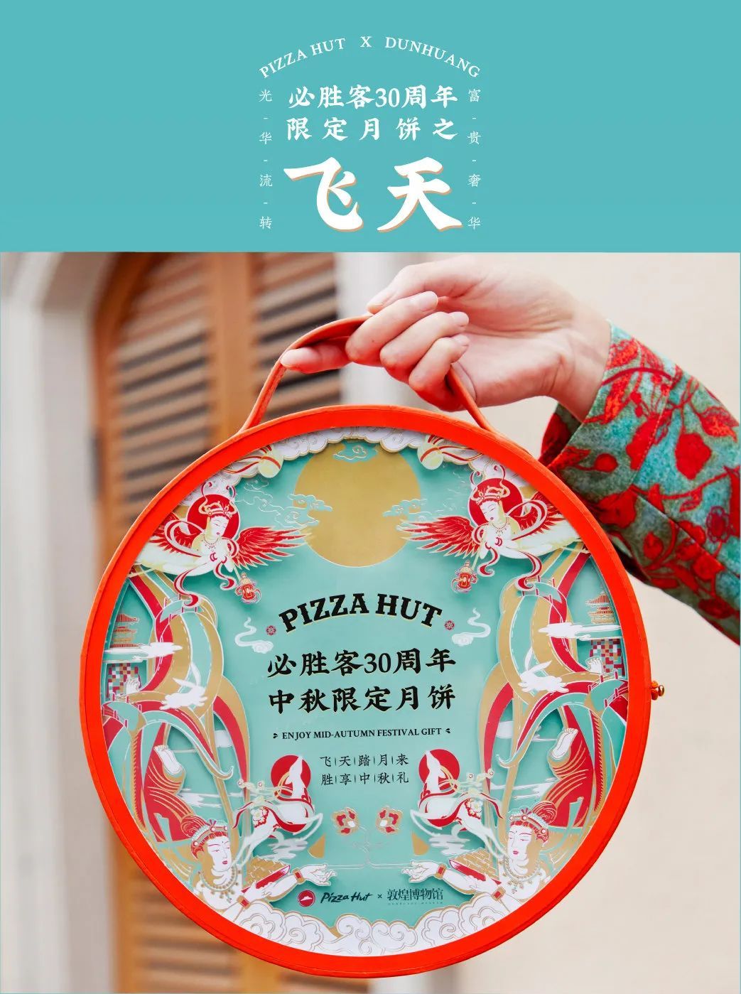 ピザハットも今年、30周年限定月餅を打ち出した。月餅のケースには、ピザハットの名前がアルファベットで書(shū)かれているほか、敦煌博物館の名前も連名で記されており、敦煌の飛天壁畫(huà)の要素が切り絵細(xì)工風(fēng)で描かれ、躍動(dòng)感のある仕上がりになっている。