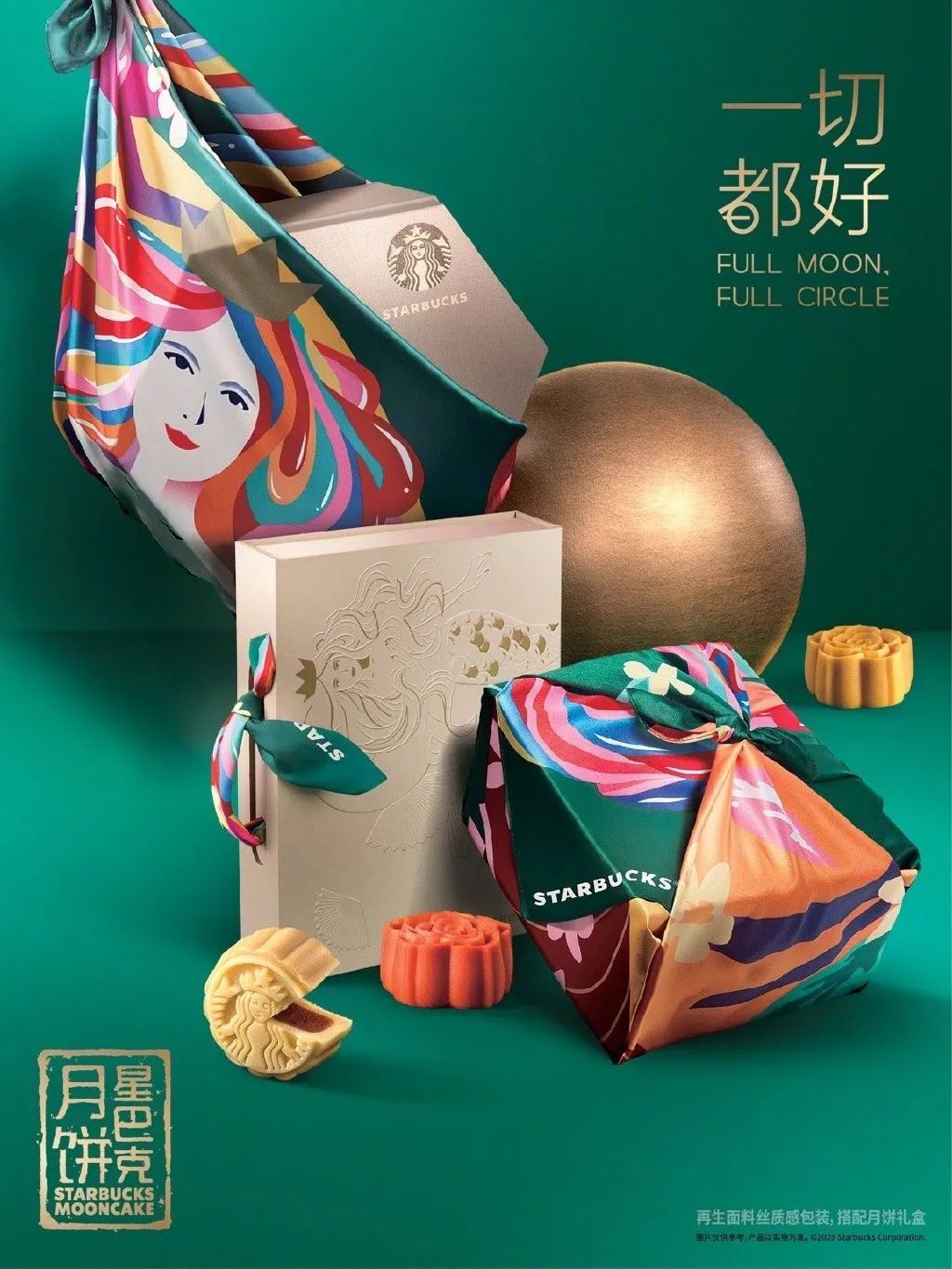 一方、スターバックスは「FULL MOON、FULL CIRCLE」をテーマにした月餅を打ち出した。ケースを包む布のデザインは、伝説の月の仙女?嫦娥にインスピレーションを得ており、満月、モクセイ、扇子、提燈など、中國(guó)らしい要素が描かれている。また、スターバックスのロゴである人魚(yú)「セイレーン」の髪や尾びれがマルチカラーになっている。シルク素材の布は、スカーフとして使うこともでき、環(huán)境保護(hù)の思いも込められたアイデアあふれるものとなっている。