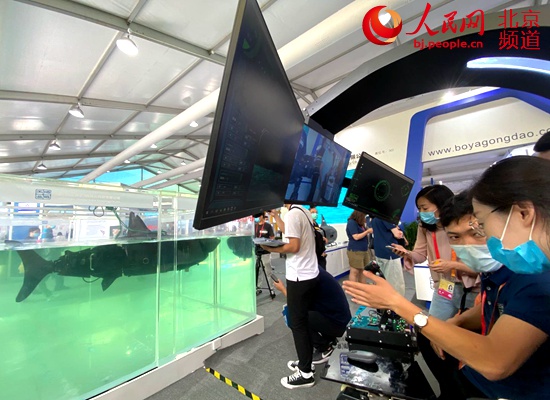 博雅工道(北京)ロボット科技有限公司の展示エリアでは、約2メートルの長さのグレーのサメが透明の水槽の中を泳いでいた。その周囲では多くの來場者がスマホで寫真を撮影していた。水槽の近くで、一人のスタッフがコントローラーを使ってサメを操作していた。スタッフの前のディスプレイには、サメの頭部に搭載されたカメラから送られてくる映像や水中のソナーの情報(bào)がリアルタイムで表示されていた。