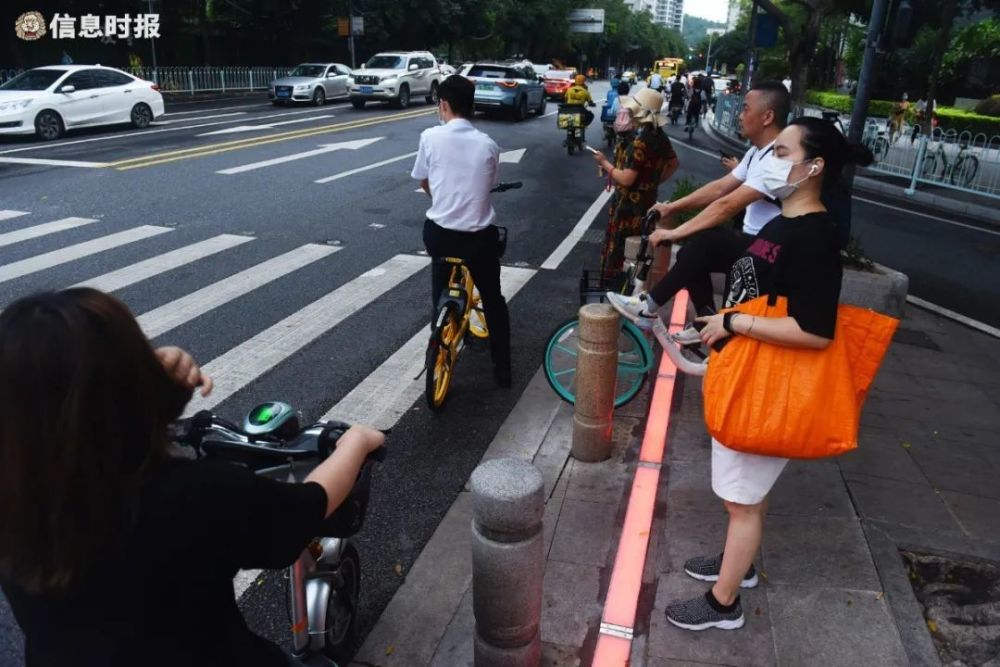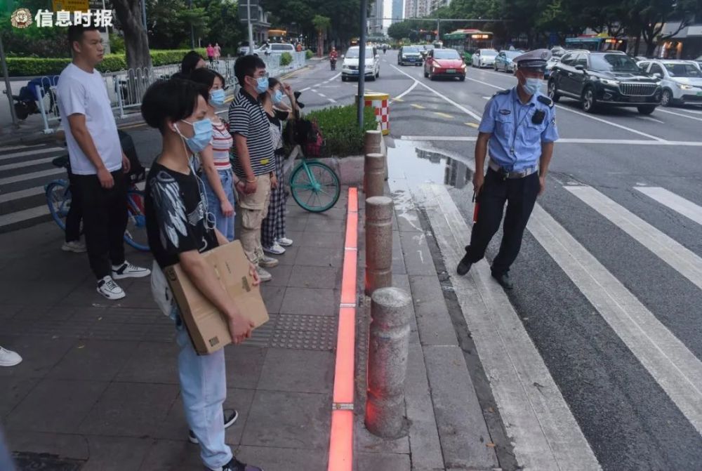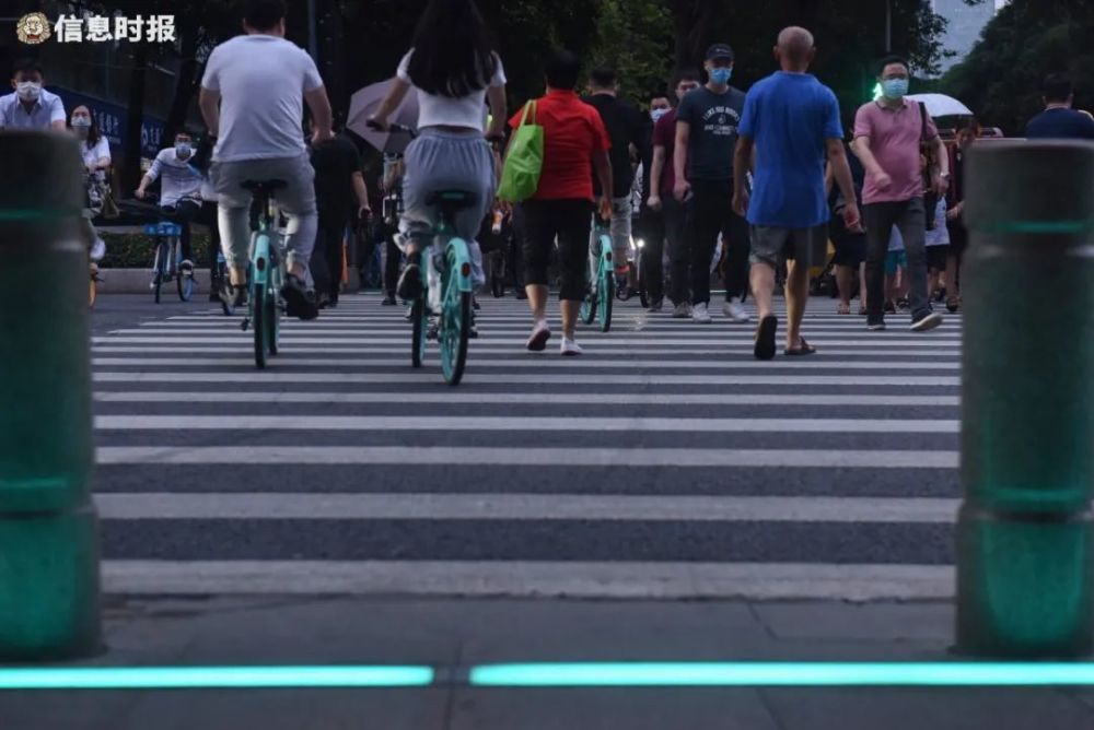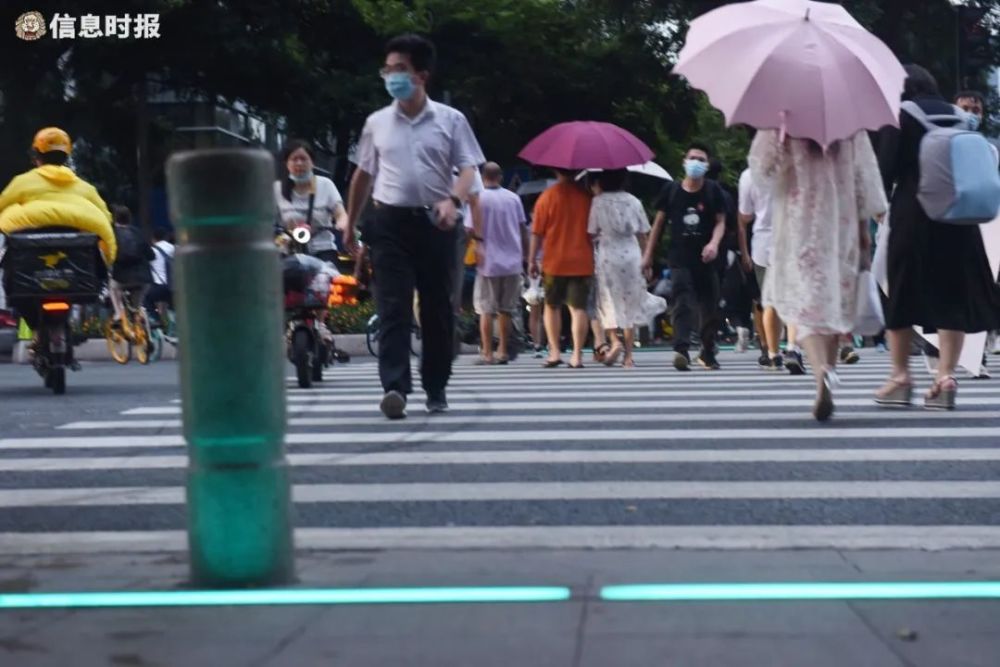 9月8日午後6時半、天河北路の交差點には、3本の橫斷歩道と1本の自転車専用レーンがあり、これらの橫斷歩道にはいずれも地面に歩行者用信號燈が備え付けられていた。信號燈の色が変わると、地面信號燈の色もそれに対応して、赤もしくは緑のライトが點滅する。歩行者が通行できる時間が殘り13秒になると、この地面信號燈は點滅し始め、歩行者に急いで渡るよう促す。また、橫斷歩道に裝備されたソーラーロードマーカーも「スマート橫斷歩道」の一部であり、このソーラーロードマーカーから出される黃色い光によって、「橫斷歩道あり、減速走行」するよう、ドライバーに注意を促している。(編集KM)