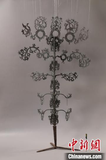 「揺銭樹(shù)」の高さは110センチで、主幹、枝葉、臺(tái)座の3つの部分で構(gòu)成されている。青銅の主幹から5本の枝葉が縦橫に交差するように伸びている。枝葉は、鳳凰、器?玉璧、人物などの形をしており、獨(dú)特の華麗な雰囲気を醸し出す非常に珍しい文化財(cái)となっている。(編集KN)