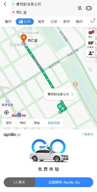 経済技術(shù)開発區(qū)で乗車を體験する際に、乗客の乗降場の推薦リストには、同仁堂、管理委員會東口、豪特耐設(shè)備公司など開発區(qū)內(nèi)の數(shù)十の乗降場の名稱が表示される?,F(xiàn)在地から最も近い乗り場を選び、「すぐに呼ぶ」をタップすると、自動運(yùn)転タクシーが配車リクエストを受けた數(shù)分後に到著する。