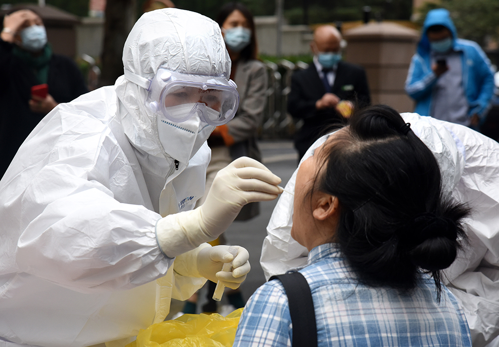 12日、市民在青島市市南區(qū)の検査場(chǎng)で無(wú)料のPCR検査の検體採(cǎi)取を受ける市民。
