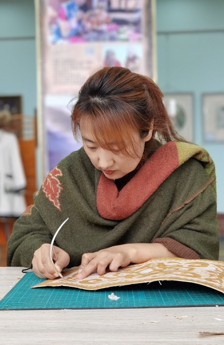 樺樹皮で工蕓品を作る陶丹丹さん(撮影?羨江楠)。