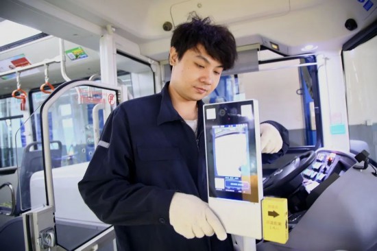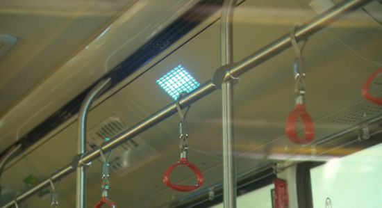 このバスには紫外線消毒、顔認(rèn)証、検溫などの各機(jī)能が備わる。説明によると、車內(nèi)の天井部分の通風(fēng)パネルに紫外線消毒殺菌燈が4臺設(shè)置され、運(yùn)行が終わり、作業(yè)員が設(shè)備を稼働させてバスから離れると、30秒後に紫外線による殺菌消毒が自動的にスタートし、30分かけて車內(nèi)の隅々まで消毒すると、また自動的に停止するという。