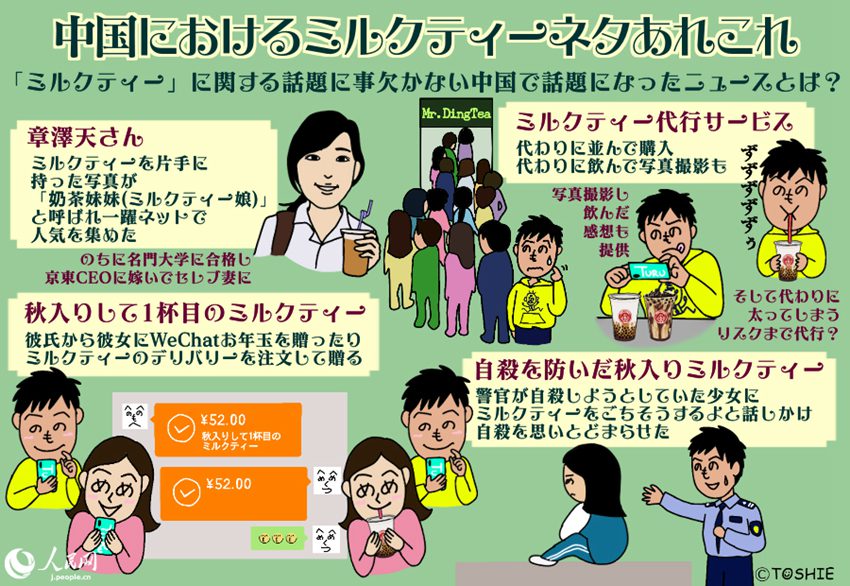 タピオカミルクティーだけでなく、「ミルクティー」自體がたびたび話題になっている中國。古くはミルクティーを片手に持った寫真で「奶茶妹妹(ミルクティー娘)」と呼ばれて一躍人気を集めるようになった章澤天さん。この他にも、次々登場する新商品に並んで飲むのは大変だという人々のために、代わりに並んで購入するだけでなく、代わりに飲んで寫真撮影までしてくれるといったミルクティー代行サービスや、昨年は、ミルクティー?ソムリエという新たな職業(yè)も話題となった。
