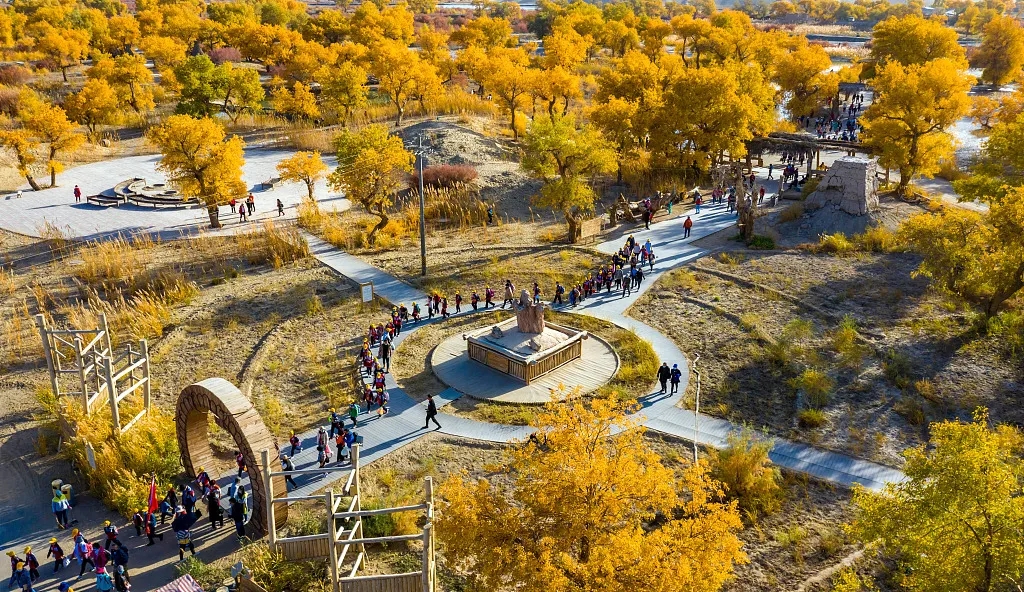 2020年10月21日、新疆維吾爾(ウイグル)自治區(qū)バインゴリン?モンゴル自治州で、生態(tài)研究?學(xué)習(xí)活動を行う小中學(xué)生。