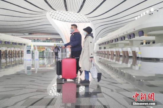 資料寫真、マスクを著用して北京大興國際空港內(nèi)を歩く男女。(撮影:賈天勇)