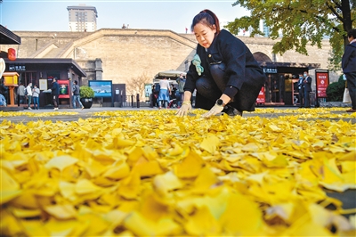 西安城壁の職員?鄭淑玲さんと同僚は今年、イチョウの木の落ち葉で西安城壁に関係した絵や文字を描く「落ち葉アート」を作っている。描かれているのは「アイラブ西安城壁」というメッセージに、二頭身の武將キャラ2人。うち、「ラブ」は、大きなハートマークで描かれ、一人でも多くの市民や観光客に城壁を理解し、好きになり、保護(hù)してもらいたいという思いが込められている。そして、そのような「愛のこもった」スタイルで、市民や観光客に、秋に絶対に行っておきたい観光スポットを提供している。(編集KN)