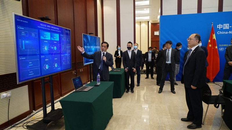 開幕式のクラウド巡回展で、中國國際貿(mào)易促進(jìn)委員會(huì)の蘆鵬起副會(huì)長にデジタル展示サービスプラットフォーム「貿(mào)促雲(yún)展」の機(jī)能を説明し、中ロ企業(yè)とオンラインで交流する中國國際展覧センターグループの賀彩龍総裁。