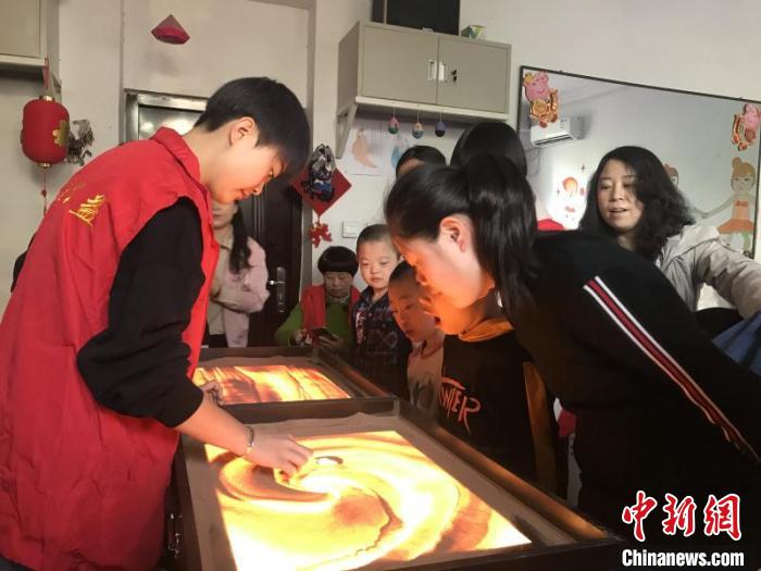 「きれい!先生、早く私にも教えて」。山西省太原市晉源區(qū)一電學(xué)校の砂絵クラブでは、砂絵のアトリエから來たボランティア教師の朱霞さんが學(xué)生に砂絵アートの描き方を教えていた。