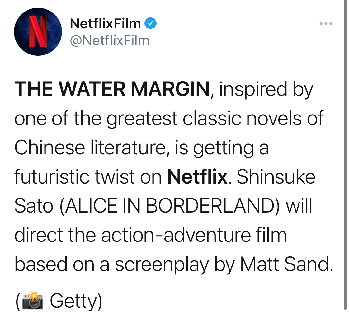 海外メディアの報(bào)道によると、米Netflixは「水滸伝」を現(xiàn)代的な解釈で描くアクションアドベンチャー映畫「The Water Margin」を製作する。メガホンを取るのは日本の佐藤信介監(jiān)督で、「バーニング?オーシャン」のマシュー?サンドが腳本を執(zhí)筆する。