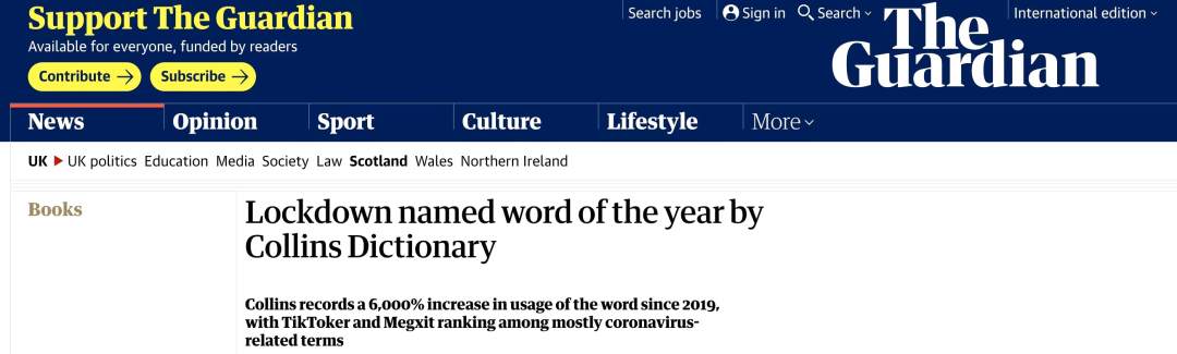 英紙「ガーディアン」の報(bào)道によると、「コリンズ英語辭典」はこのほど、2020年の「今年の言葉」に、「ロックダウン(lockdown)」を選出した。