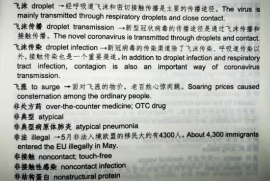 「漢英新冠詞典」には7683語が収録されている。収録されているのは、頻繁に使われている新型コロナウイルス関連のワードとフレーズ、専門用語で、「方艙醫(yī)院(mobile/cabin hospital; makeshift hospital)」、「保持社交距離(to maintain social distancing; to keep physical distancing)、「呼吸衰竭(respiratory failure)」、「咽拭子(throat swab)」などが含まれている。さらに、「直播帯貨(influencer marketing)」や「無接觸配送(contactless delivery)」など、中國の新しい表現(xiàn)方法も収録されている。