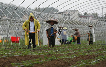 10月14日、貴州省銅仁市玉屏トン族自治県のイチゴ栽培基地で農(nóng)民を率いてイチゴに施肥する村幹部。(胡攀學(xué)/人民図片)
