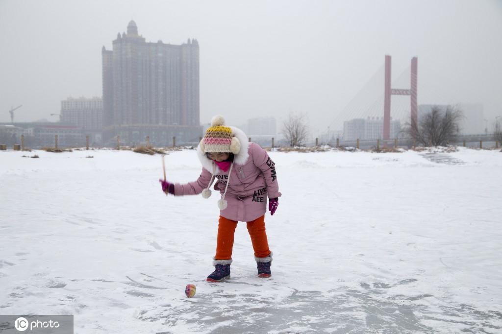 吉林省吉林市松花江畔で、寒さをものともせず、氷上コマ回しを楽しむ女の子(寫真著作権は東方ICが所有のため転載禁止)。