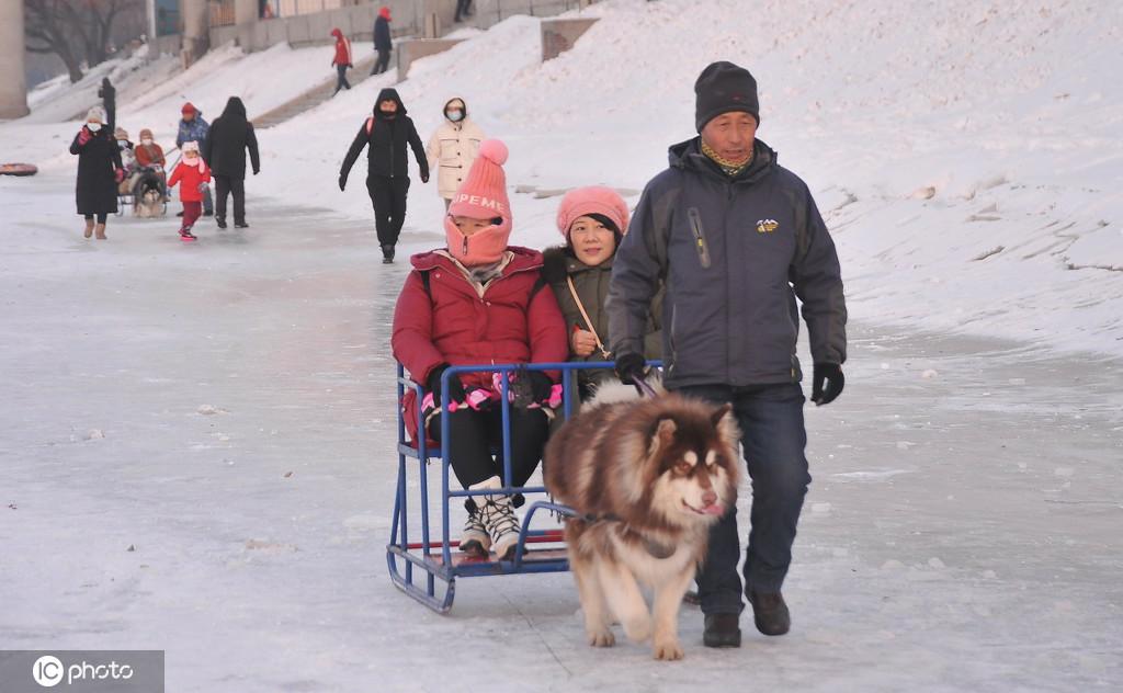 黒竜江省哈爾浜(ハルビン)市道里區(qū)松花江畔で、凍結(jié)した川面で犬ぞりを楽しむ観光客(寫真著作権は東方ICが所有のため転載禁止)。