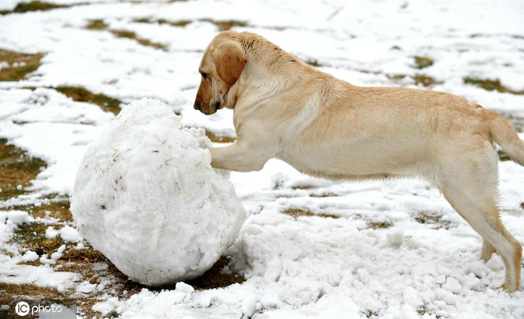 河南省洛陽市で、降雪後、飼い主が作った雪だるまで遊ぶ犬(寫真著作権は東方ICが所有のため転載禁止)。
