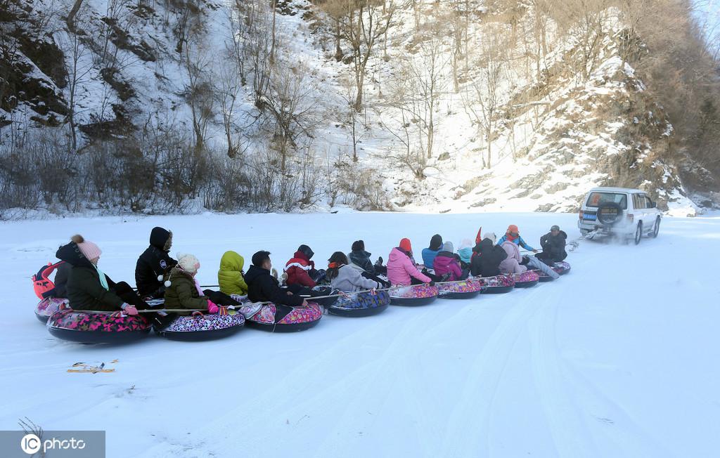 吉林省白山市撫松県興隆郷南天門村近くの川面で、オフロード車がスノーチューブ20個を引っ張って走行。スノーチューブで雪の上を滑り、スリルを楽しむ観光客たち(寫真著作権は東方ICが所有のため転載禁止)。