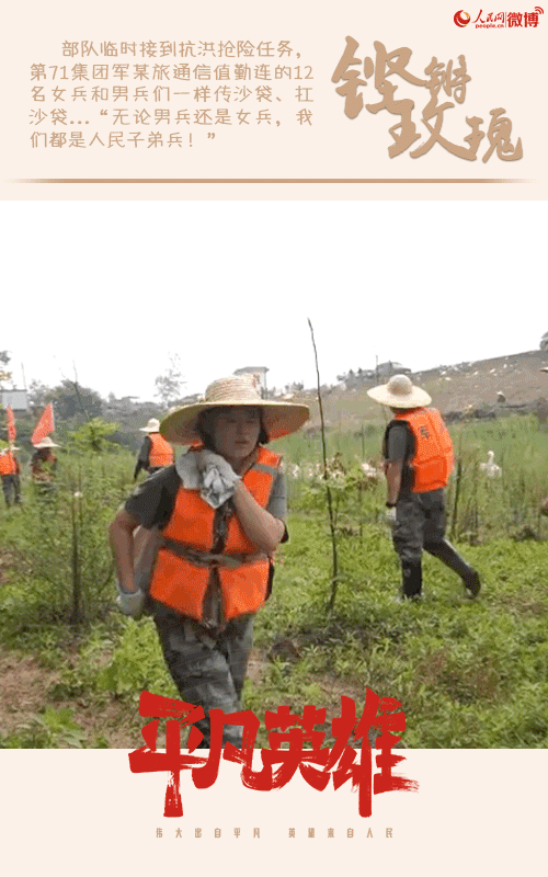 緊急の災(zāi)害救援活動任務(wù)を受けた第71集団軍某旅通信當(dāng)番連では、女性兵士12人も男性兵士たちと共に土嚢をリレーし、擔(dān)いで運(yùn)んだ?!改行员郡扦ⅳ炫员郡扦ⅳ?、我々はみな人民の軍隊(duì)の兵士だ!」