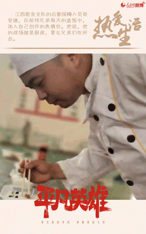 江西新余支隊(duì)の後方支援保障人員である鄭安建さんは、災(zāi)害支援の前線に立つ仲間のために毎日食事を用意。その際、容器に詰めたご飯の上に、食材で作ったオリジナルの顔文字をあしらっていた。鄭さんは、「自分にとっての戦場は廚房。仲間たちにおいしく食べてほしい」と語った。