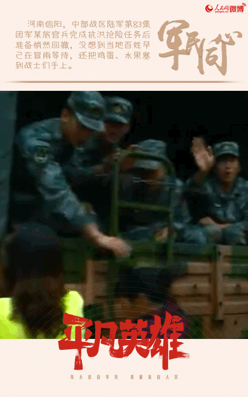 河南省信陽市で、中部戦區(qū)陸軍第83集団軍某旅の士官?兵士は、災(zāi)害救援任務(wù)を終え、黙々と撤収準(zhǔn)備をしていた。すると思いがけないことに、地元の人々が雨の中にもかかわらず、すでに彼らを待ちうけており、お禮として卵や果物を兵士たちの手に押し付けるようにして渡すシーンが見られた。