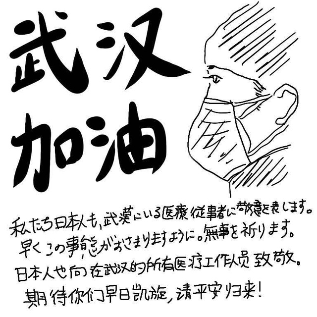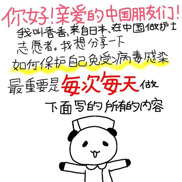 中國が全力で新型コロナウイルスと闘っていたとき、中國語メッセージ付きのイラストを作成して、中國の友だちに送ったことに、多くの中國人ネットユーザーが感動(dòng)を覚えた。イラストはナースキャップをかぶったパンダ「香香」が主人公。ネットユーザーは親しみを込めて、巖崎さんを「香香」と呼ぶようになった。