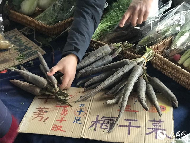 北京有機(jī)農(nóng)夫市集は、安全な野菜の作り手と安全な野菜を買いたい消費(fèi)者を結(jié)びつける交流の場でもある。実際、今回出店していた農(nóng)園の一つ、「小柳樹農(nóng)園」では、珍しい野菜の名前や食べ方について、農(nóng)園を経営する柳鋼さんから直接説明を聞きながら買い物をすることができた。この日、柳さんのお店で特に目を引いたのは、黒くて細(xì)長い根菜。柳さんに尋ねてみると、その正體は「黒ニンジン」。割ると中身は濃い紫色で、試食させてもらったら、あまりニンジン臭さがなく食べやすかった。また、からし菜を漬けて干した梅干菜は、なんとピザにするとおいしいのだという。こんな風(fēng)に新しい発見があるのも、生産者から直接買えるファーマーズマーケットの楽しみだ。