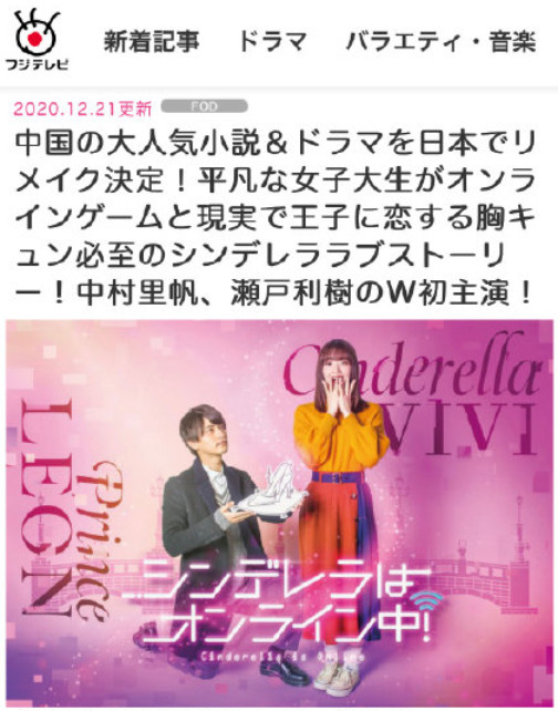 中國(guó)の大人気小説「シンデレラはオンライン中」が日本でドラマ化 中村里帆と瀬戸利樹(shù)が主演