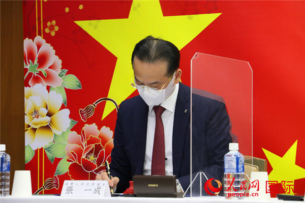「明海大學(xué)と國(guó)際人材交流協(xié)會(huì)とのキャリア支援に関する覚書(shū)」に調(diào)印する國(guó)際人材交流協(xié)會(huì)の張一成會(huì)長(zhǎng)(撮影?李沐航)。