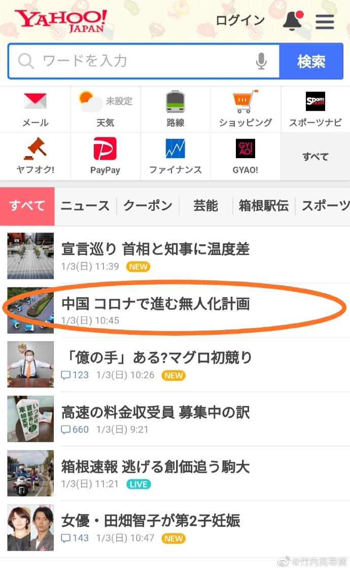「中國 アフターコロナの時代」は今月3日、ヤフー?ジャパンのトップページでも「中國 コロナで進む無人化計畫」として紹介された。