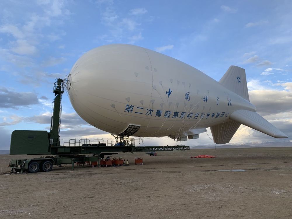 中國(guó)科學(xué)院青蔵高原研究所納木錯(cuò)マルチゾーン総合観測(cè)ステーションの観測(cè)キャンプで撮影されたエアロスタット「極目1號(hào)」(2019年5月30日撮影)。(撮影?新華社記者田金文)