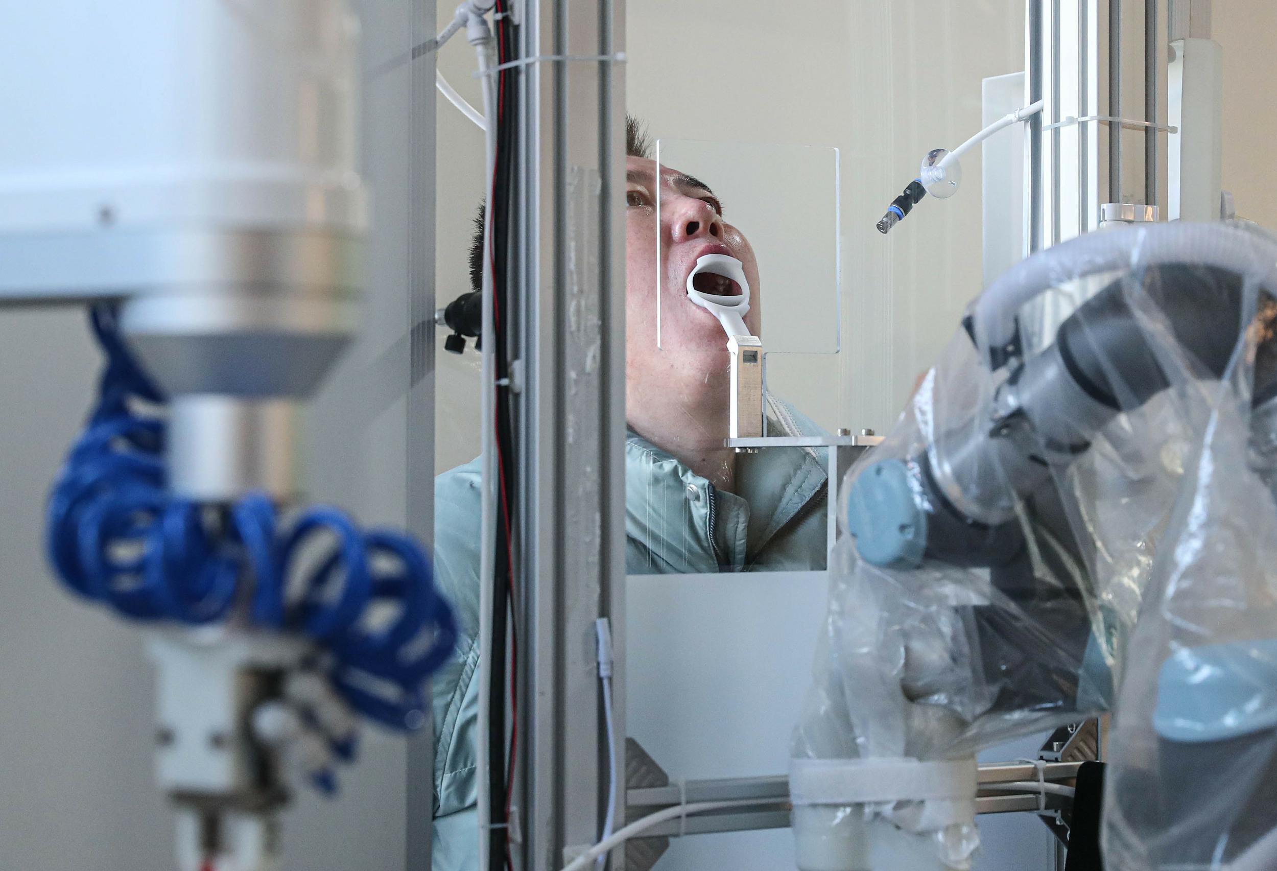 1月13日、遼寧省瀋陽市寧山路コミュニティのPCR検査所に登場した「霊採」咽頭拭い検體採取ロボット。醫(yī)療スタッフの代わりに、咽頭拭い検體を自動(dòng)採取する様子(寫真著作権はCFP視覚中國が所有のため転載禁止)。