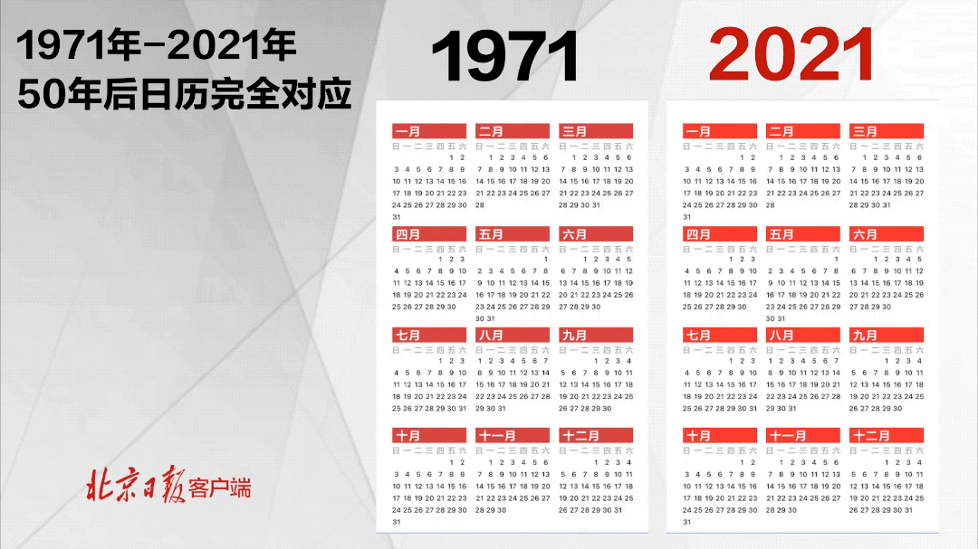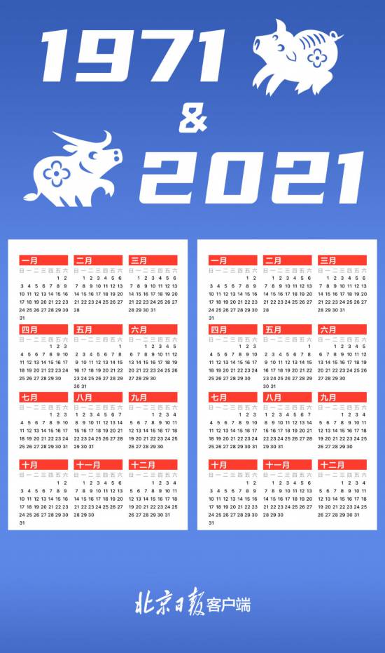 中國(guó)のネット上で最近、1971年と2021年のカレンダーを比較した畫像が話題となり、ネットユーザーの間で議論が巻き起こっている。よく見てみると、1971年と今年は、日付と曜日の配置が全部同じだ。時(shí)間と月日の流れの無(wú)情さを感じると共に、多くの人は「これは50年に一度のレアケースなのか」と好奇心を高めている。北京日?qǐng)?bào)が報(bào)じた。