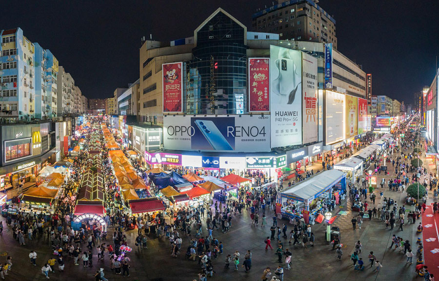 2020年10月3日、人通りが多く賑やかな山東省青島市臺東商業(yè)歩行街(寫真著作権はCFP視覚中國が所有のため転載禁止)。
