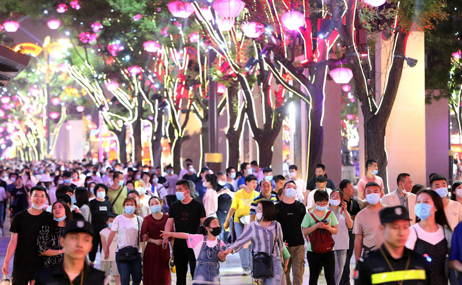 2020年5月4日夜、陝西省西安市、観光客が途絶えることのない大唐不夜城(寫真著作権はCFP視覚中國が所有のため転載禁止)。