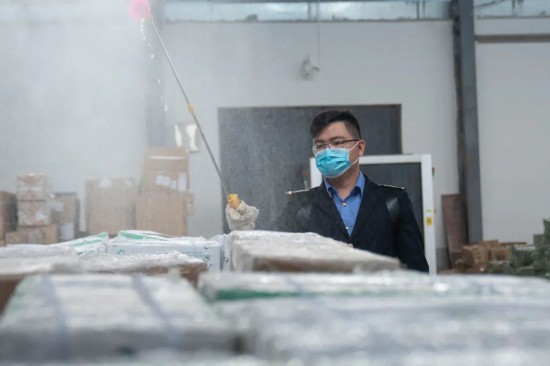 倉(cāng)庫(kù)に到著した貨物を消毒するスタッフ(撮影?彭婉雲(yún))。