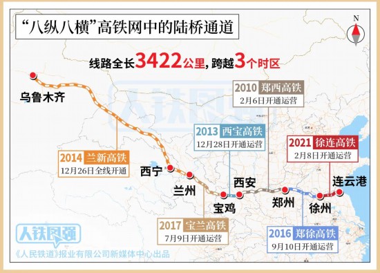 徐連高速鉄道は、「八縦八橫」の連雲(yún)港とウルムチを結ぶ路線の最東區(qū)間であり、最後に開通した區(qū)間となる。開通後、すでに開通している鄭州-徐州、鄭州-西安、西安‐寶鶏、寶鶏-蘭州、蘭州-ウルムチ高速鉄道とつながり、全長3422キロの高速鉄道路線が完成する。そして、「新ユーラシア?ランドブリッジ経済回廊」発展に有力な下支えを提供すると期待されている。