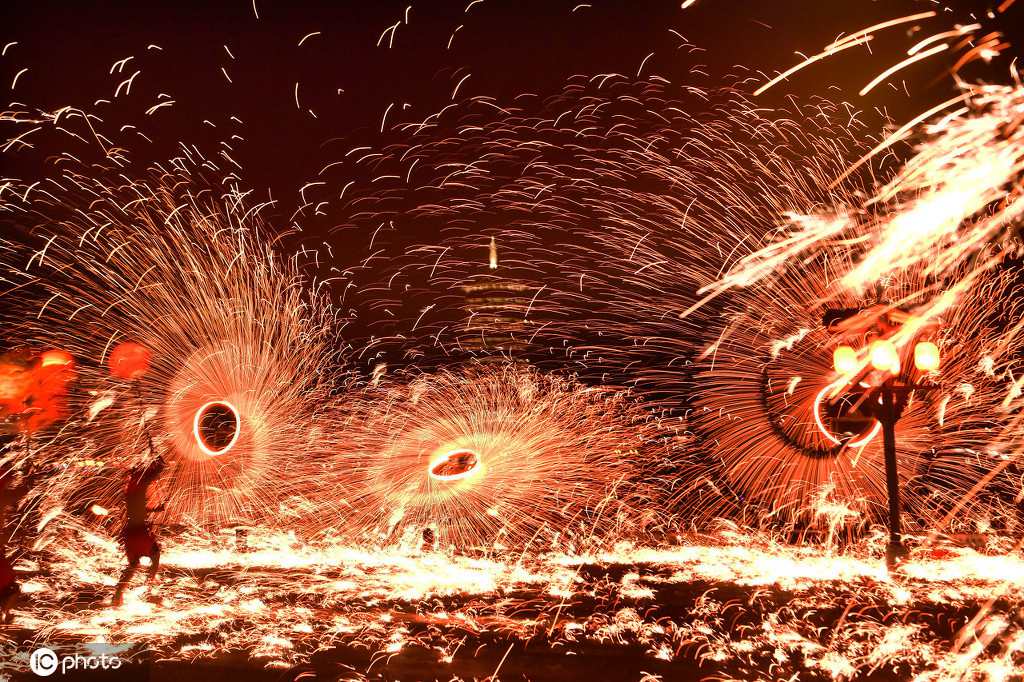 2021年2月15日夜、湖南省長沙市銅官窯古鎮(zhèn)で無形文化遺産の絶技「打鉄花」が披露され、「鉄の花」が流星群の如く空いっぱいに舞った。(編集NA)