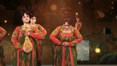 豊満だった唐代の女性を表現(xiàn)するため、ダンサーたちがスポンジを詰めた衣裝を著用し、口の中に綿を含んでいたことも注目に値する。また頬に2本の弧を描くことで、唐の女性の間で流行した化粧「斜紅」を完全に再現(xiàn)した。