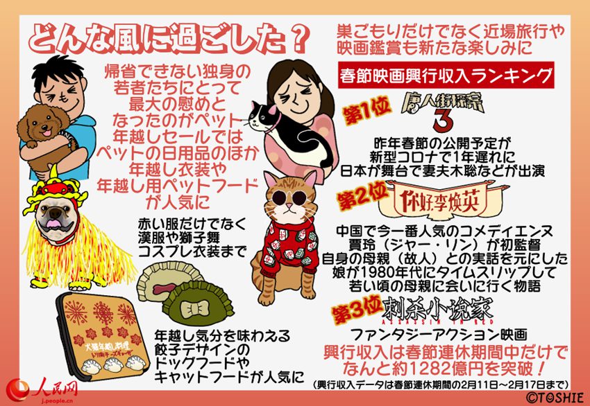 年越し前から各ネットショッピングサイトでは大々的な年越しセールが始まり、今年は「春節(jié)期間中も営業(yè)」を掲げたネットショップが目立った。また、人々の買(mǎi)い求める年越し用品のラインナップからも、例年とは異なる年越しとなったことが見(jiàn)てとれた。特に帰省できない獨(dú)身の若者たちにとっては、ペットが最大の慰めになっており、ペット関連商品の売り上げが急増。ペットの年越し衣裝から年越し用特製ペットフードまでペットと共に過(guò)ごす春節(jié)を楽しむためのグッズが人気を集めた。