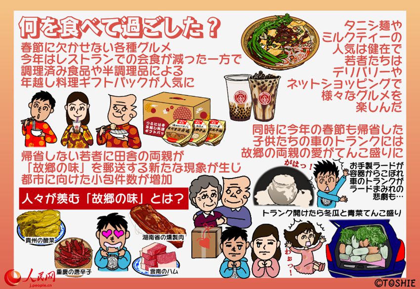 大晦日の夜に食べる「年夜飯(年越し料理)」だけでなく、テレビを見(jiàn)たり、おしゃべりを楽しみながらつまむおやつやフルーツなど、春節(jié)に美味しい食べ物は欠かせない。今年はレストランでの會(huì)食は例年に比べると減った一方で、調(diào)理済み食品や半調(diào)理品による年越し料理ギフトパックが人気に。また、帰省しない若者たちは春節(jié)期間中もデリバリーやネットショップを活用し、様々なグルメを楽しんだ。