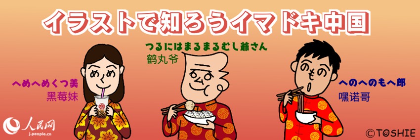 人民網(wǎng)ではもっと身近なスタイルで今どきの中國(guó)を読者の皆さんに知ってもらうため、「つるにはまるまるむし爺さん」と「へのへのもへ郎」、「へめへめくつ美」の3人が流行語(yǔ)やカルチャー、時(shí)事問(wèn)題など幅広いジャンルにおける「イマドキ」を紹介。中國(guó)ってこんな國(guó)なんだ!と興味を抱き、理解を深めるきっかけにしてみてください。