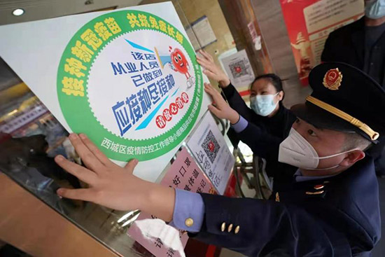 22日、北京市西城區(qū)のあるレストランに足を運ぶと、市場監(jiān)督管理當(dāng)局の職員が、レストランに「新型コロナウイルスのワクチンを接種して、免疫の長城をみんなで建設(shè)しよう」と書かれたポスターを張っていた。また店內(nèi)では、ワクチン接種を受けた店員が、「接種済み」と書かれたシールを胸に付けていた。