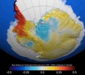 長(zhǎng)期的なデータモニタリングを通じ、科學(xué)者はこの南極全體の気溫変化図を作成した。図を見(jiàn)ると、南極の大半の地域の気溫に大きな変化がなく、上昇幅はいずれも0.25度以下となっている。赤色の部分は南極半島で、表面溫度が1957年より3.5度上昇している。